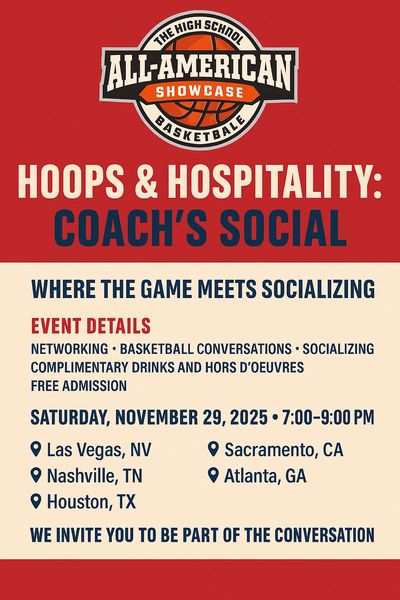Join us for an evening created exclusively for High School, College, AAU, and Youth Basketball Coaches to relax, connect, and share their love of the game. Enjoy a casual, welcoming atmosphere where coaches can network, exchange ideas, and learn more about upcoming opportunities with The High School Basketball All-American Showcase.